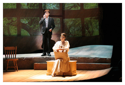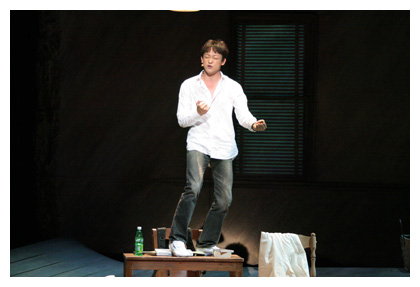 印象的なピアノのフレーズが流れるなか物語は幕を開けた。愛するジェイミーが部屋を出ていき、打ちひしがれるキャサリン。ハスキーで温かみのある井手の声が劇場に響き、別れを受け止められない切なさが胸に染みてくる。そこへ登場するのが、キャサリンと出逢ったばかりで仕事も絶好調の5年前のジェイミー。愛と希望に燃えた若者を、山本が生き生きと演じる。力強くて時に甘く響く歌声が魅力的だ。