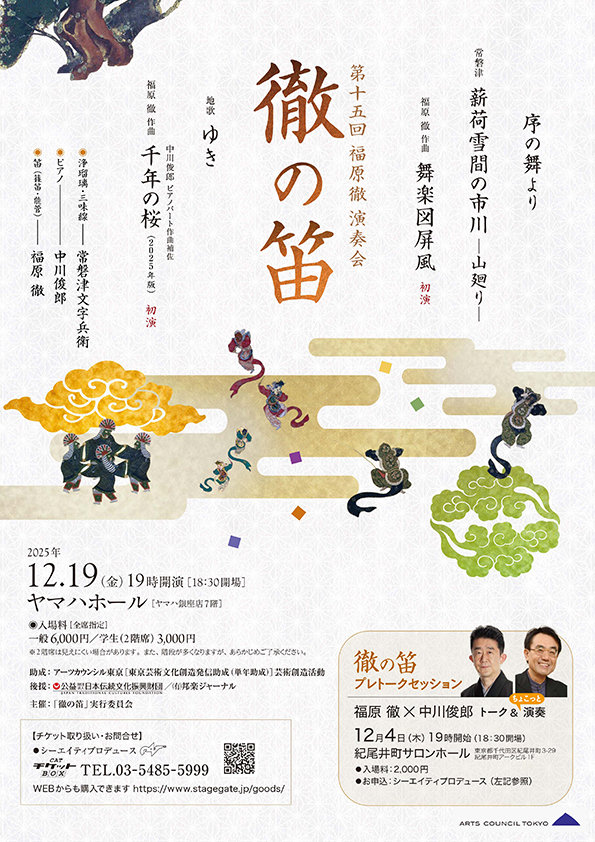 | 演目 | 序の舞より 笛:福原 徹 薪荷雪間の市川 ─山廻り─ 弾き語り:常磐津文字兵衛 笛:福原 徹 舞楽図屏風〈初演〉 作曲:福原 徹 笛:福原 徹 ゆき 笛:福原 徹 千年の桜(2025年版) 〈初演〉 作曲:福原 徹 ピアノパート作曲補佐:中川俊郎 笛:福原 徹 ピアノ:中川俊郎 |
